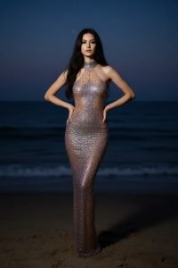 Gara, mirdzoša vakarkleita ar pieguļošu siluetu un caurspīdīgām detaļām